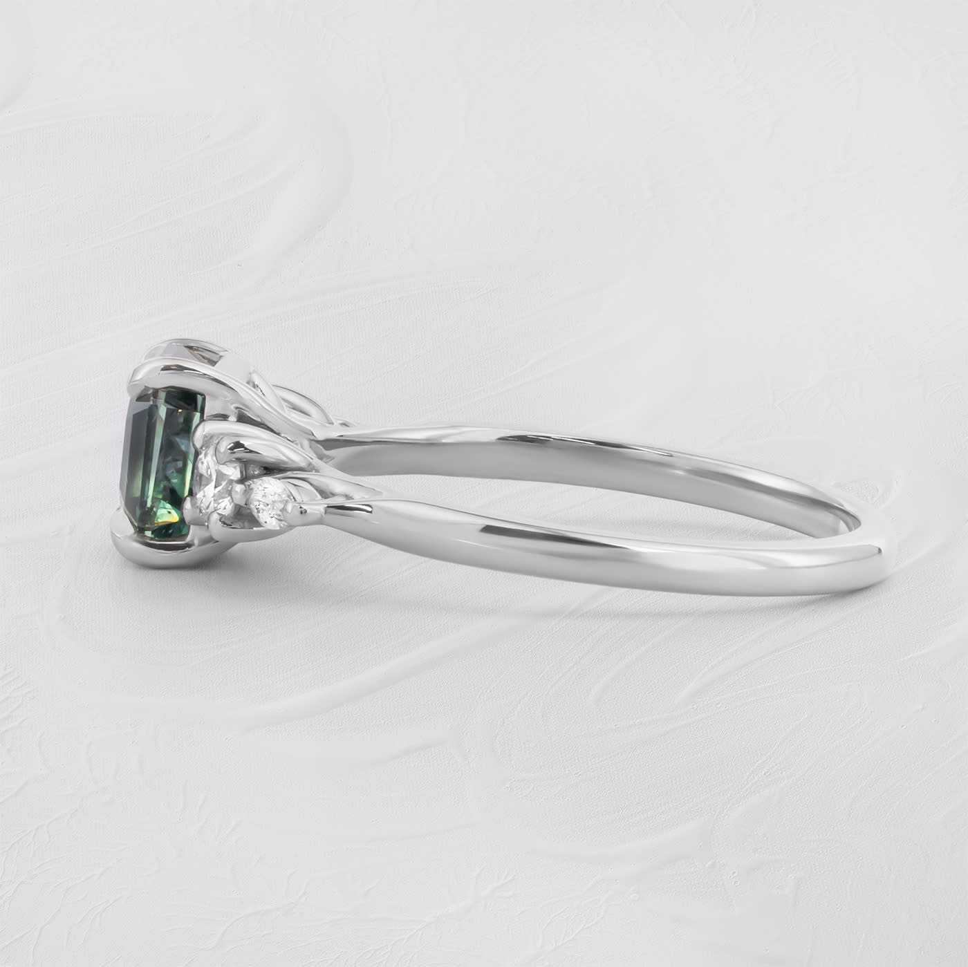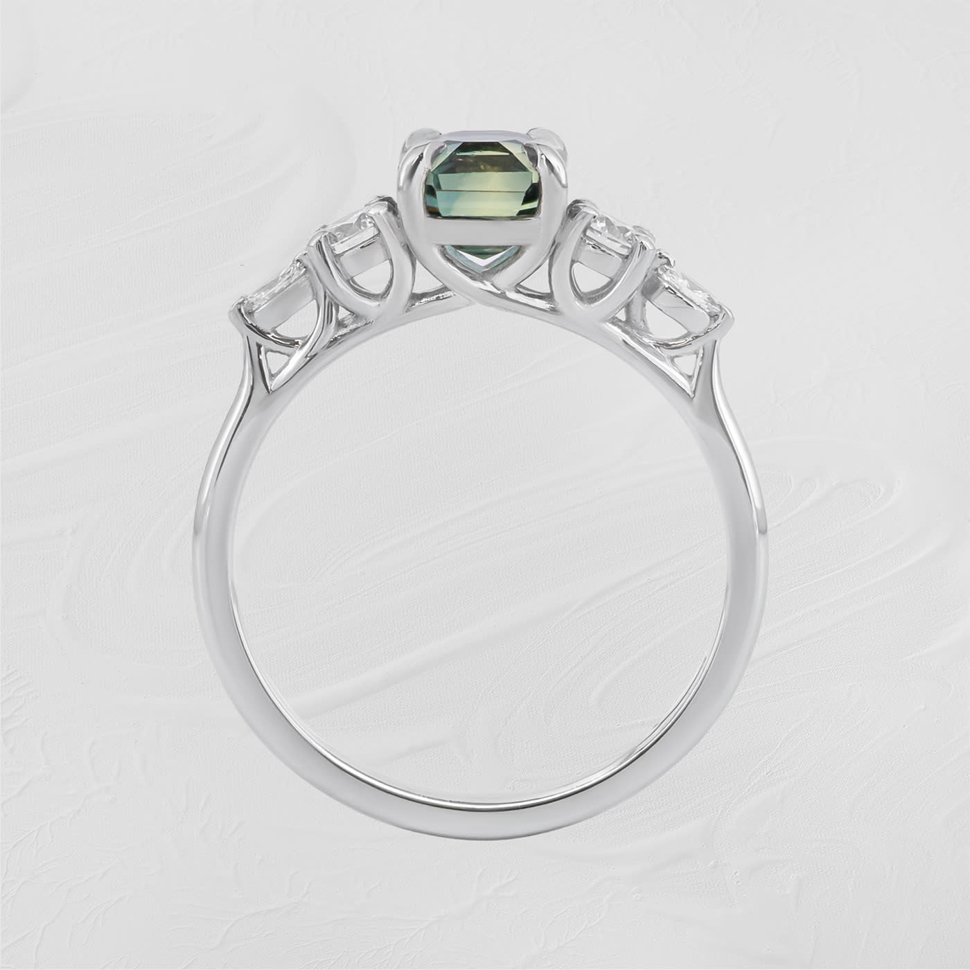 Emerald cut teal sapphire and diamond trellis ring