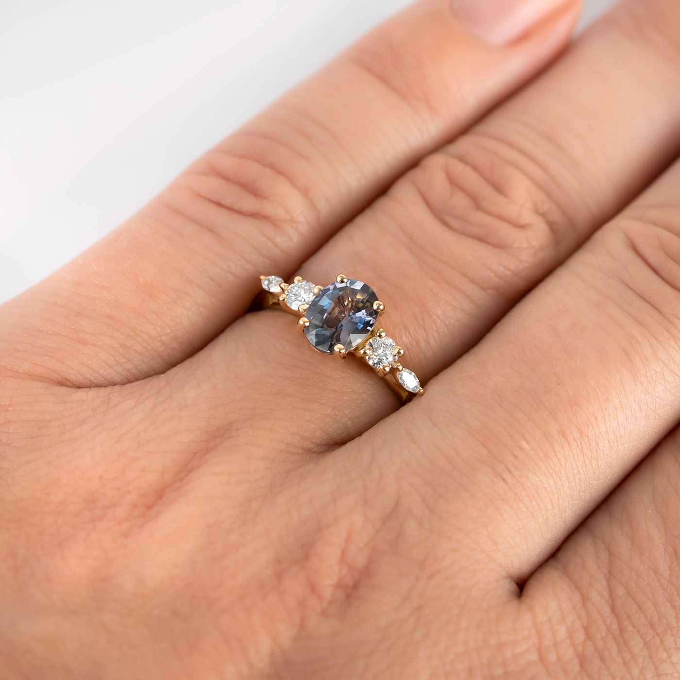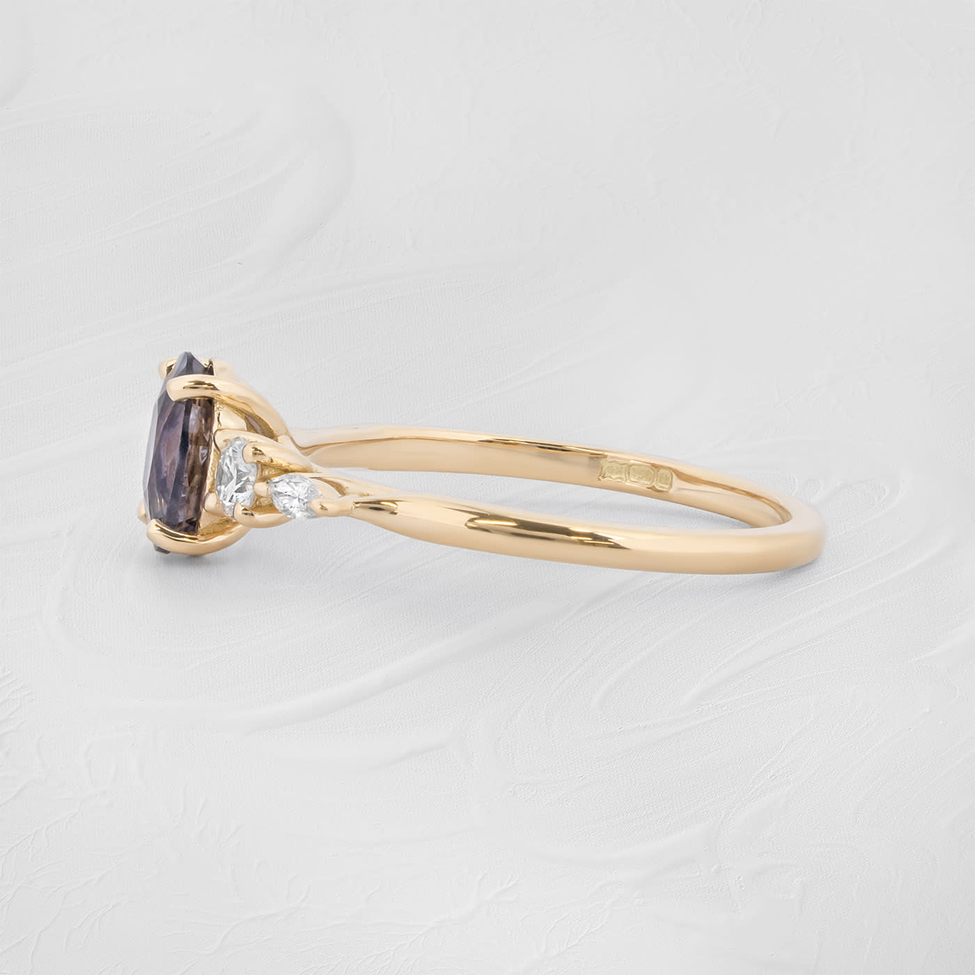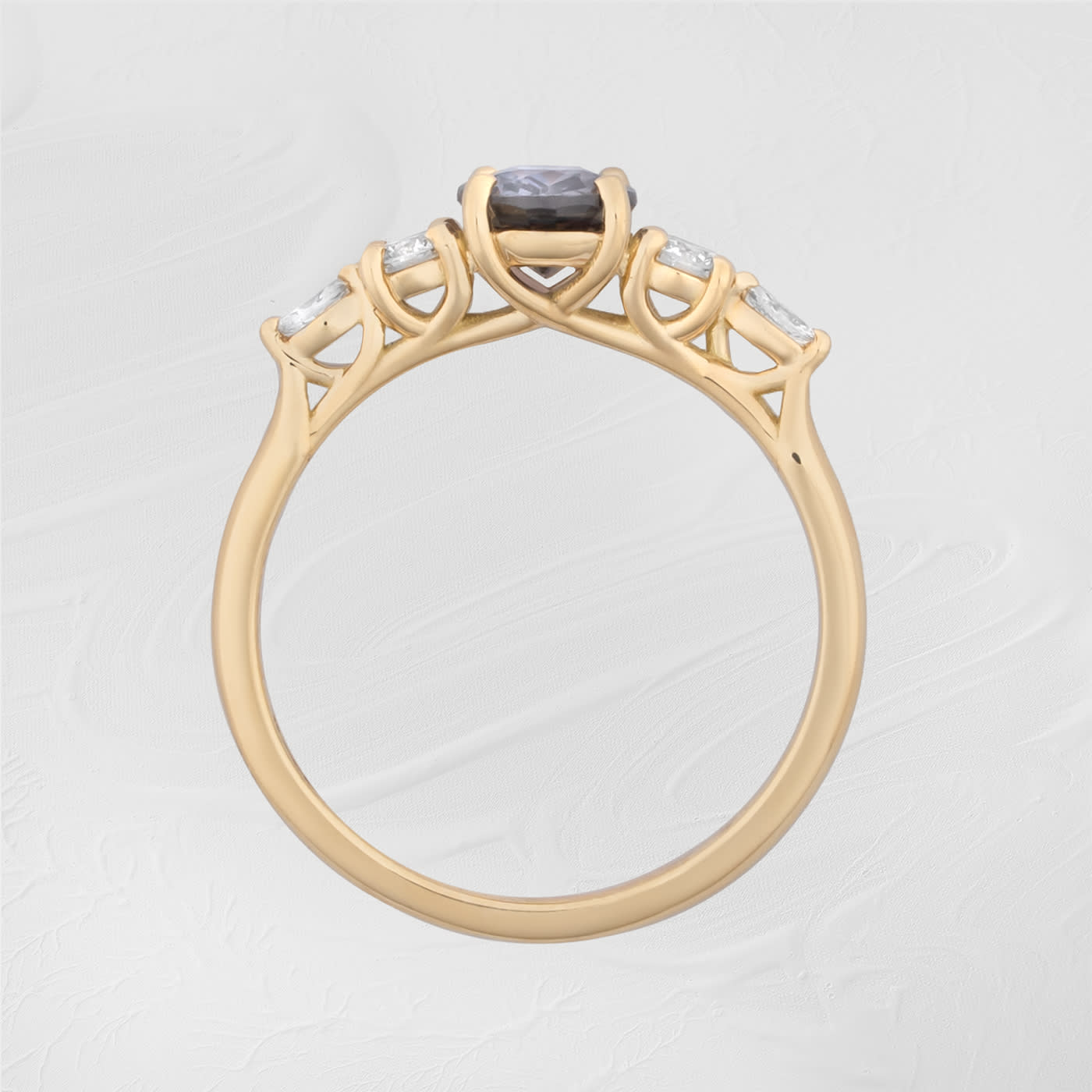 A gorgeous new sapphire and diamond ring in our stunning trellis detail setting, featuring a central 1.12ct natural grey and blue sapphire sapphire, flanked with round and marquise diamonds all in 18ct yellow gold.